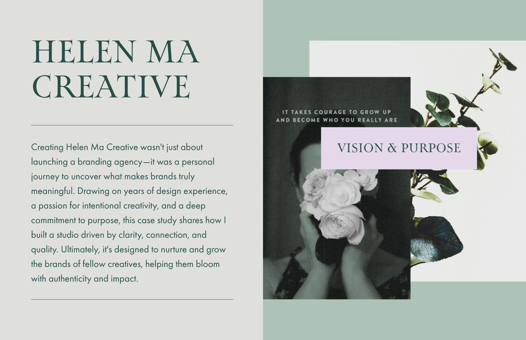 I'm Helen Ma, a one-person studio with 20+ years in design. After my own journey from scattered focus to purposeful branding, I now guide solopreneurs like you to create cohesive, meaningful brands that reflect your values and ease your load.